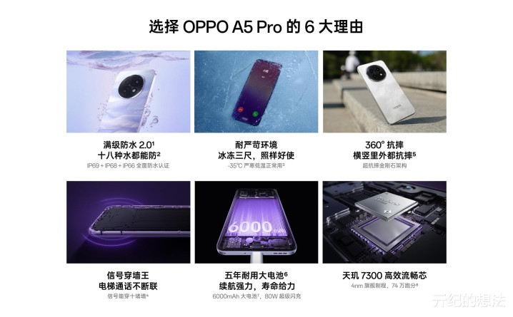 对于以上四款耐用机型,亓纪的想法是这样的:红米Note14 Pro的优势是不错的性能和影像,还有更细腻的1.5K护眼屏,体验和实用性在四款机型中遥遥领先。OPPO A5系列防水和防摔做到了极致,续航方面也各有特色,并且兼顾轻薄机身和NFC。至于vivo Y300 Pro,优势是32MP自拍和80W闪充,颜值和价格方面也不错。